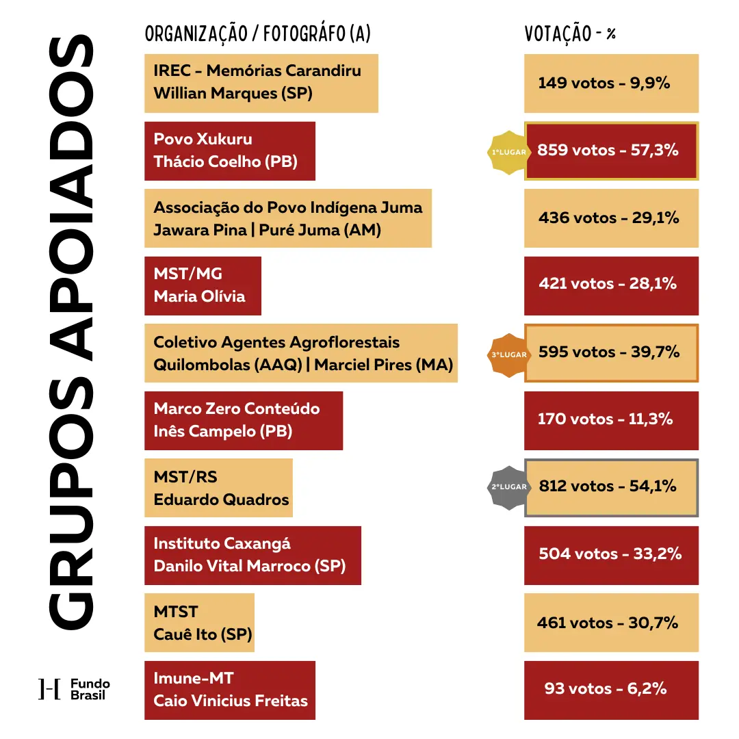 Os demais finalistas entre os Grupos Apoiados: Instituto Caxangá – Danilo Vital Marroco (504 votos|33,6%), MTST – Cauê Ito (461 votos|30,7%), Associação do Povo Indígena Juma Jawara Pina – Puré Juma (436 votos|29,1%), MST/MG – Maria Olívia (421 votos|28,1%), Marco Zero Conteúdo – Inês Campelo (170 votos|11,3%), IREC / Memórias Carandiru – Willian Marques (149 votos|9,9%) e Imune – Caio Vinicius Freitas (93 votos|6,2%).