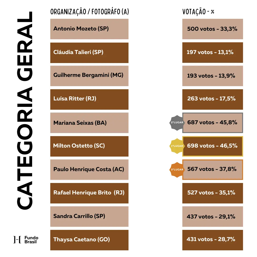 A votação para escolha das imagens vencedoras teve 1.500 respostas de formulário, em que cada pessoa teve que votar em seis fotografias, três para a categoria Grupos Apoiados e três para a categoria Geral. Assim, a soma do total de votos é de 9 mil. O período de votação do concurso foi das 19h do dia 1º de dezembro às 19h do dia 8 de dezembro, no horário de Brasília. Conforme o regulamento, os vencedores receberão do Fundo Brasil, como prêmios, drone e equipamentos fotográficos (1° lugar), cursos sobre fotografia e vídeo (2° lugar) e kit de acessórios fotográficos para celular (3° lugar).